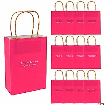 • Quality: These stylish gift bags are sure to make your present stand out from the pack. Just add some tissue paper and a personal message for a beautiful gift presentation!• All Occasion Use: These versatile personalized gift bags are perfect for year-round gift-giving. From birthdays to baby showers to anniversaries and more, these bags are ready for any occasion! • Travel-Friendly: Once the party is over, your guests will be happy to take home your favorite cookies, cake pops, cupcakes or other baked goods in these easy-to-carry bags.Product Description:Add a special touch to wedding supplies or event supplies with these personalized kraft bags! Welcome wedding guests with these bags full of wedding favors, wedding weekend itineraries or local favorites. Or, use them as personalized anniversary party supplies or any event you’d love to commemorate. Choose a hue that matches your wedding colors or party scheme and you’re set! Personalize with 2 lines of text. Printed with silver foil. © OTCSize: 6 1/2″ x 3″ x 9″ with 4″ jute handles.Quantity: 12Material: Paper.