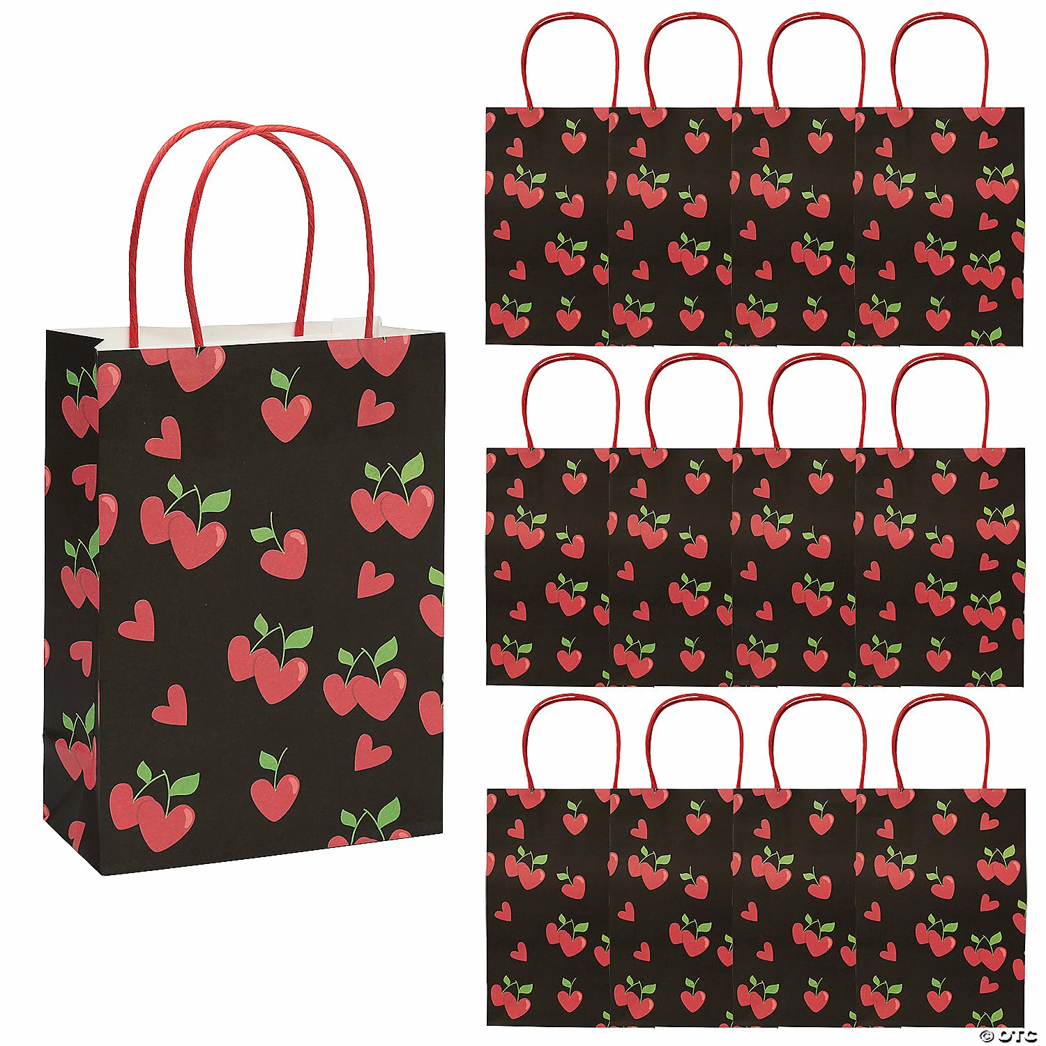 • Easy Gift Wrapping: These sturdy gift bags are suitable for holding a variety of presents and come with easy-to-carry handles. They make wrapping any gift easy breezy!• Quality: These stylish gift bags are sure to make your present stand out from the pack. Just add some tissue paper for a beautiful gift presentation!• Ready to Gift: With several gift bags on hand, you’ll never be caught unprepared when it’s time to wrap a gift again!Product Description:Heart shaped-cherries are by far the most romantic of made-up fruits. These cute bags are perfect for handing out Valentine’s Day treats or party favors or to use at any event or gathering centered on love. These gift bags’ love theme is nicely complemented by the red-colored handles. Find plenty of great treat options right here on this website to fill these bags! © OTCSize: 6 1/2″ x 3 1/4″ x 9″ with 4″ handles Quantity: 12Material: Kraft paper.
