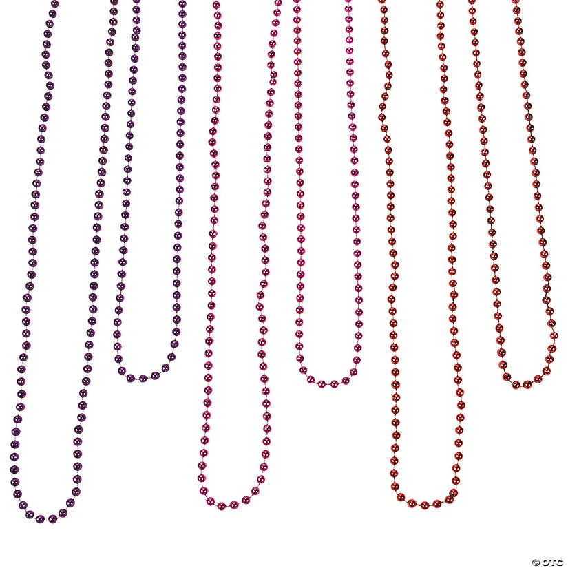 Pile on our Red, Purple & Fuchsia Beaded Necklace Assortment! These plastic metallic Mardi Gras party supply beads add sparkle and shine to any outfit. Mardi Gras beads are fun for any holiday and event! In red, purple and fuchsia, these shiny necklaces are perfect party decorations and party favors at classroom Valentine’s Day parties or other celebrations! (144 pcs. per gross) 33″ Assortment may vary. © OTC