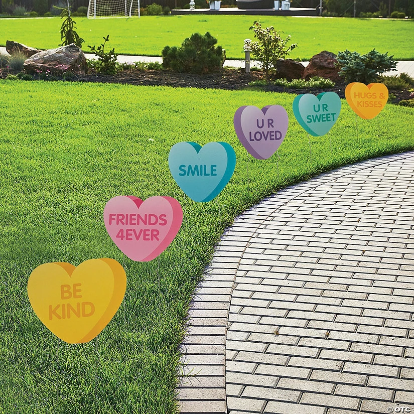 Surprise your favorite sweetheart with some sidewalk signs to celebrate Valentine’s Day. A fun surprise for a loved one, these signs also work well as outdoor decoration for a Valentine’s Day party. Each sign looks like a candy conversation heart and has cute messaging like “U R Sweet”, “Hugs & Kisses” and more. Corrugated plastic. (6 pcs. per unit) 12 1/2″ x 11″ Includes metal stakes. Single-sided. Simple assembly required. © OTC Conversation Hearts Sidewalk Sign Instructions