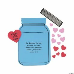 Fill up on God’s love with this kids’ activity! Ideal for Sunday School crafts, church events and at-home creativity, this craft kit features a Bible verse reminding us to “Honor one another above yourselves,” along with red and pink hearts that kids can place strategically to fill up their jars with love. Includes self-adhesive foam pieces. 5 1/2″ x 8″ Makes 12. All craft kit pieces are pre-packaged for individual use. Kits include instructions. © OTCFilled With Love Mason Jar Craft Kit Instructions