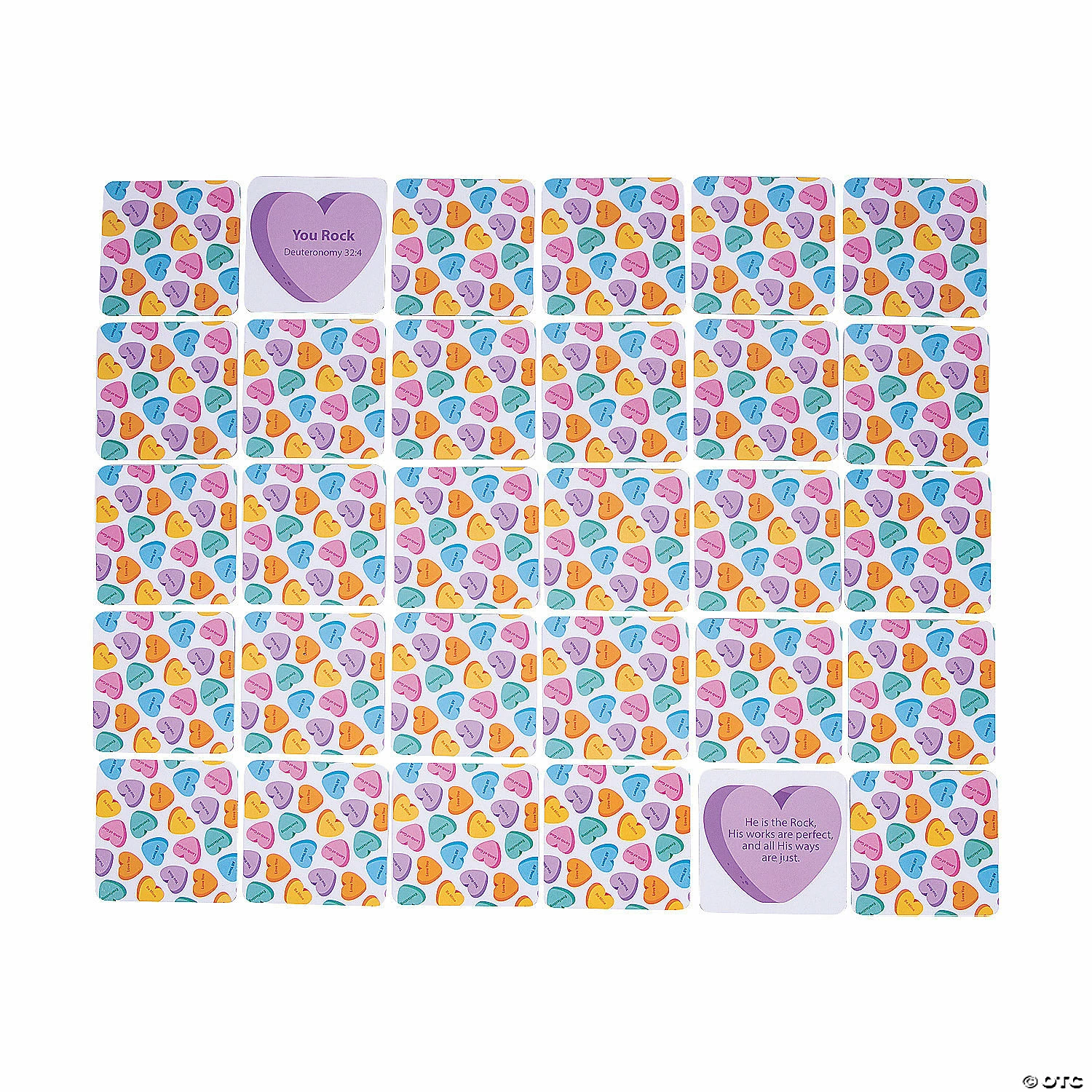 Mix up your routine with a new Sunday School game! With this group matching game, kiddos can master important Bible verses while having fun with their classmates. The matching game cards have color-coded pairs with one card printed with the verse’s title (i.e. John 3:16) and the other card printed with the full verse. The cards are designed to look like conversation heart candies, so the religious game is a fun activity for Valentine’s Day but can be used year-round, too. Playing cards come in a 5-1/4″ x 5-1/4″ x 2-1/2″ box with instructions. Cardboard. (56 pcs. per unit) 4 1/2″ © OTC