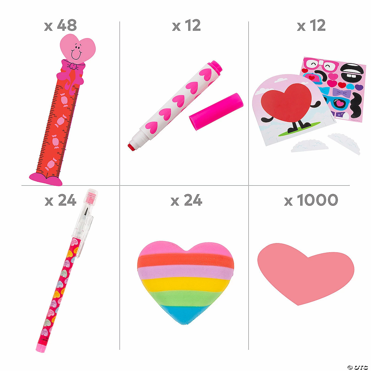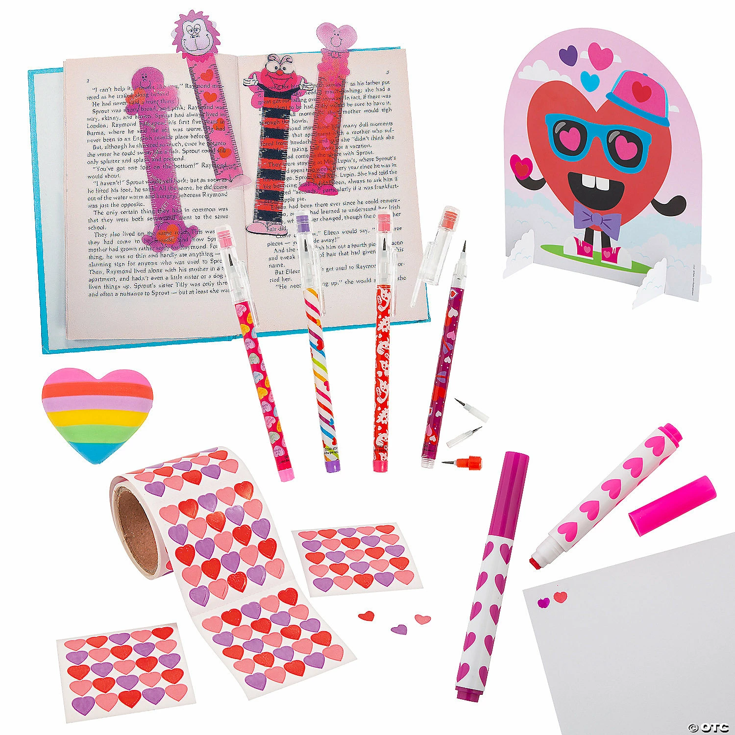 Bring bright smiles to classrooms with this Valentine’s Day kit. This convenient kit features several Valentine themed stationery items that make great game prizes or classroom handouts. These charming items can also be used to replenish classroom reward boxes! (121 pcs. per unit)Includes:• 1 roll Paper Mini Heart Big Roll Stickers (1/4″ 1000 stickers per roll, shrink-wrapped.) • 48 Vinyl Valentine Character Ruler Bookmarks (5 1/4″)• 24 Rubber Rainbow Heart-Shaped Erasers (1 1/4″)• 24 Plastic Valentine Stacking Heart Pencils (5”)• 12 Plastic Valentine Heart Design Marker Stamps (5 1/4″ Safe and non-toxic. Conforms to ASTM D-4236.)• 12 Cardstock Valentine’s Day Heart Changing Face Sticker Scenes (7″ x 7 1/2″ Each set includes 1 background sheet, 1 sticker sheet and 2 stands.)• Assortments are subject to change at any time and may vary from picture shown. Substituted items will be similar in nature.