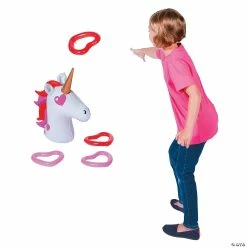 A classic game with a fun twist! Add this Unicorn Valentine’s Day Ring Toss Game to your Valentine’s Day party activities! Great for classroom Valentine’s Day parties along with daycares or just for the home! There is a plug on the bottom of the unicorn to fill with water or sand to create a weighted base. Vinyl. (7 pcs. per set) Includes six 7 1/2″ x 6 3/4″ rings and one 19 1/2″ x 24″ unicorn. © OTC