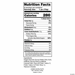 • What’s Included: You get 6 jumbo swirl lollipops on plastic sticks. They’re individually wrapped and have big fruit flavor. • Non-Returnable: Candy is non-returnable. For more information, visit the Return Policy page located on our website.• Important Country of Origin Information: For certain items sold by OTC on our Web or Mobile sites, country of origin information can change and what is displayed may not be accurate or consistent with manufacturer information. For up to date country of origin information, it is recommended that you rely on product packaging or other manufacturer information.• Product Information: These jumbo, swirled lollipops are fat-free, dairy-free, gluten-free and nut-free. Details about ingredients, nutrition, allergens and other product information are provided on our Web and Mobile sites for reference purpose only, without warranty or representation as to accuracy. Manufacturers adjust their labeling regularly and are solely responsible for the accuracy of the information. For general questions concerning these items, please contact our customer service at 800-228-0475.Product Description: Jumbo-sized fun on a stick! These oversized jumbo swirl lollipops are big on fun and fruit flavor. They’re perfect as carnival prizes, candy buffet displays and part favors. They’re sure to draw everyone’s eye, especially when in the hands of a little kid. Style in glass jars as sweet decorations for your candy buffet wedding reception, carnival birthday party or circus-themed corporate event. The set includes six individually wrapped jumbo lollipops on plastic sticks. Specs:Size: 4″ lollipop, 7″ stickQuantity: 1 lb. total, 6 lollipopsDietary needs: Fat-free, dairy-free, gluten-free and nut-freeBrand: © OTC – Oriental Trading Company