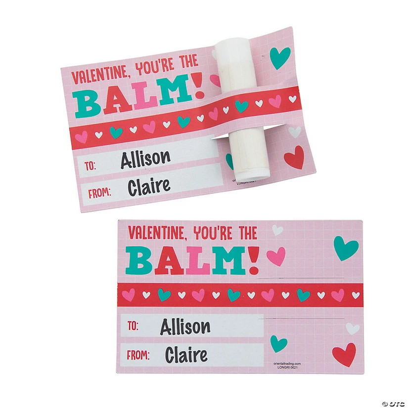 Show valentines that you think they’re the “balm” when you hand out these clever Valentine’s Day giveaways! Featuring a colorful card and useful container of lip cover, these gifts also make a unique statement as school or home Valentine’s Day party favors. Includes cardstock card with a To/From space. Plastic. (2 dozen per unit) Lip cover, 2 1/4″; cards, 4 1/4″ x 2 3/4″. Simple assembly required. © OTC