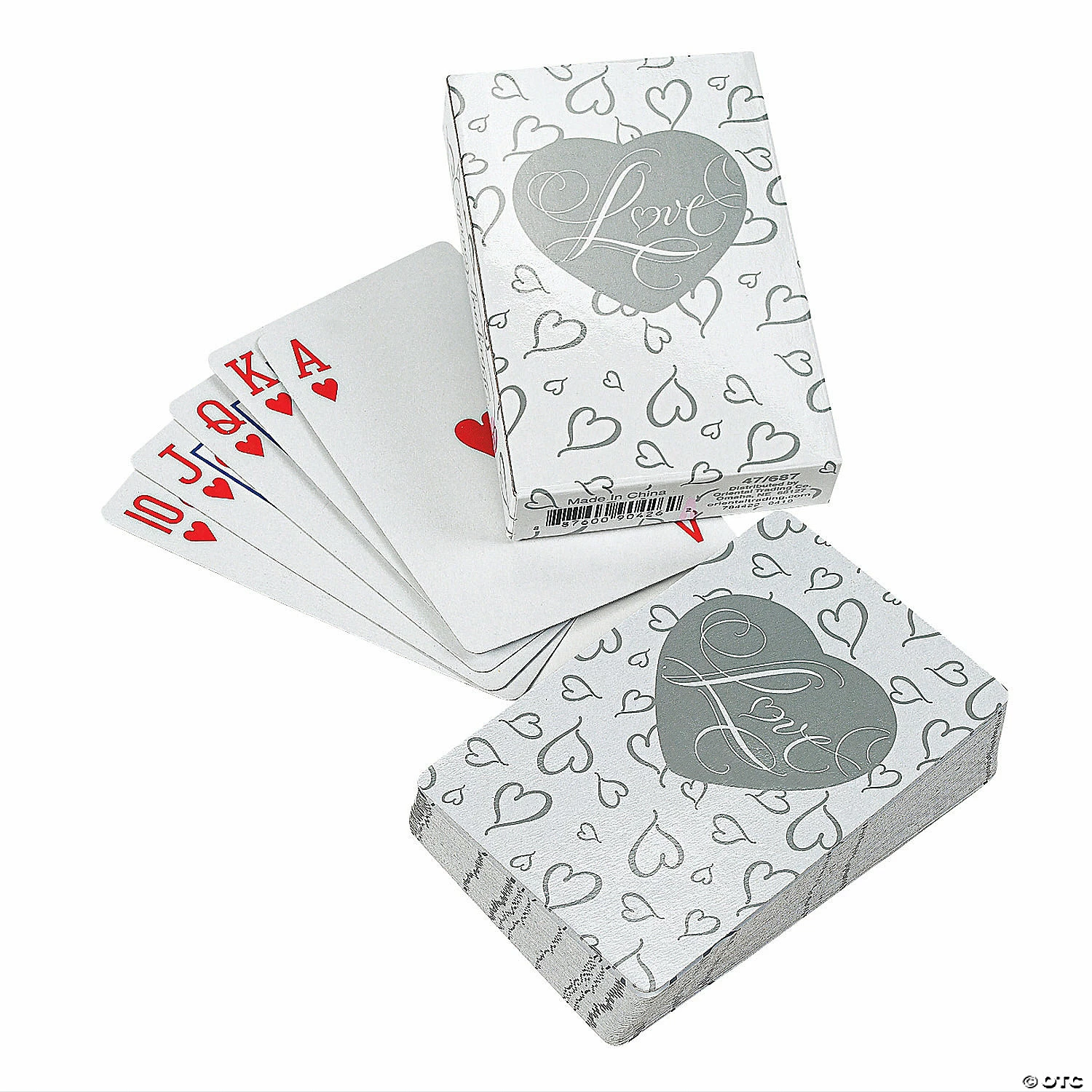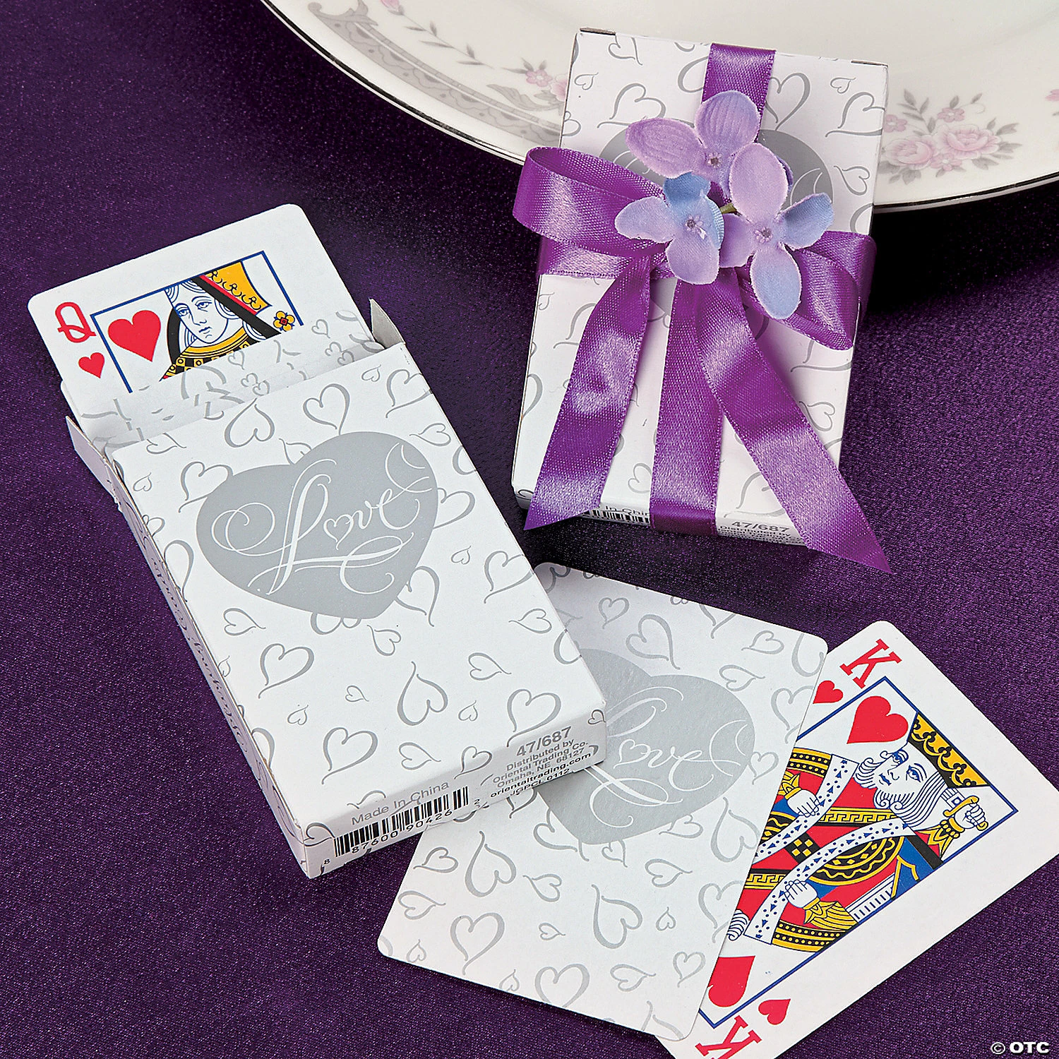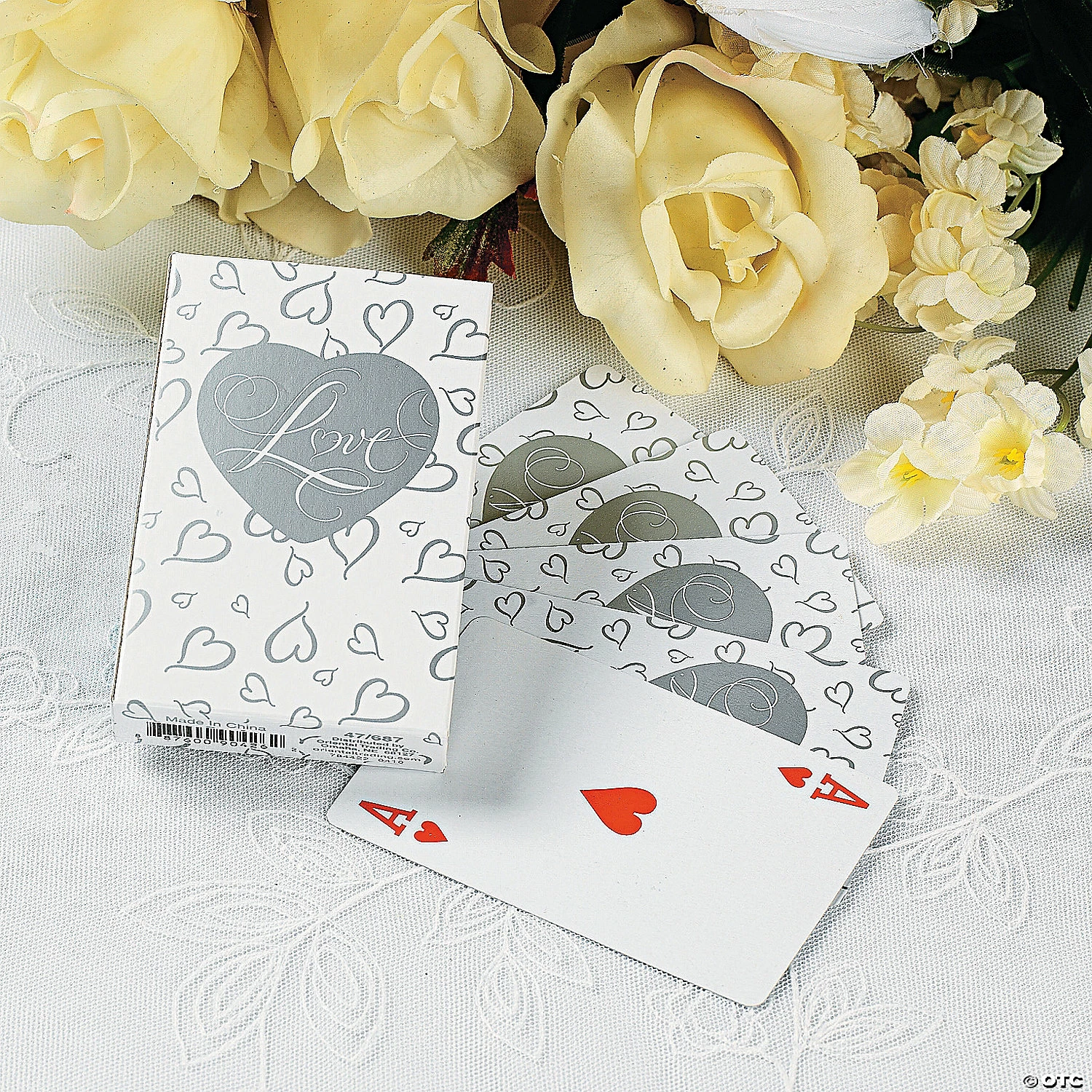 You’ll be the king and queen of hearts on your big day! “Love” Wedding Playing Cards feature a silver heart with “Love” written inside surrounded by a pattern of silver outlines of hearts. Fun for a casino-themed shower or reception, or give them out to your wedding party. Includes 54 cards per deck. 3 1/2″ © OTC