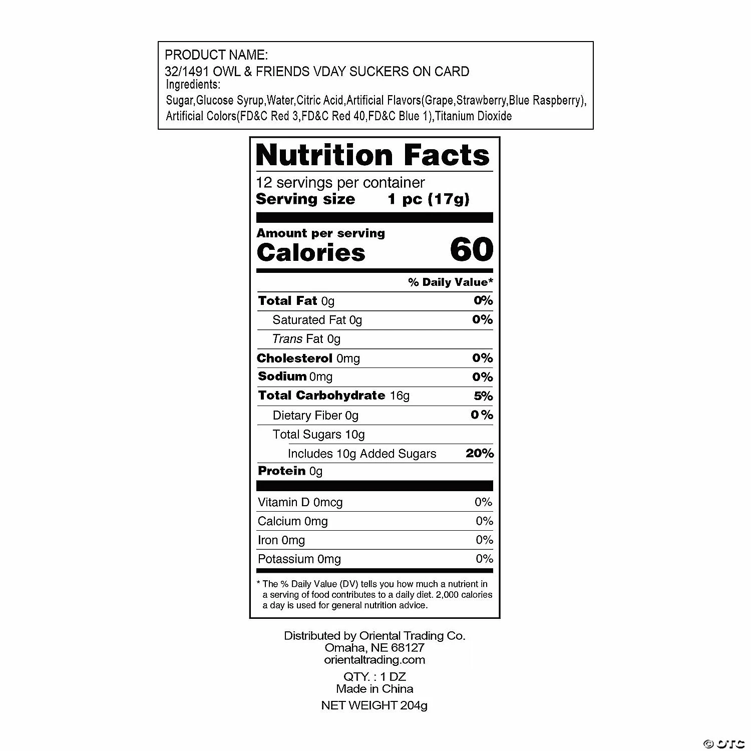 Give a sweet Valentine’s card with these cute owl greetings and darling suckers. With adorable designs and engaging messages, they are perfect for handing out at a classroom Valentine’s Day party. Each 2″ grape, strawberry and blue raspberry-flavored pop is on a 4″ plastic stick with 3″ cardboard card. Total weight, 14 oz. Fat-free. Candy is non-returnable. For more information, visit our “Return Policy” page located on our website. © OTC