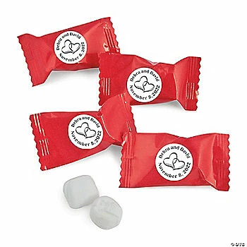 Hand these sweet treats out as fresh and easy wedding favors. Choose the shade to match your wedding theme and use these buttermints to fill clear glass jars at your candy buffet. Perfect for goody bags or sprinkling on your wedding tables for favors that double as decorations. Each candy wrapper features an adorable sticker with a two hearts design to symbolize your love. Personalize the sticker with 2 lines of 18 spaces/characters per line. Shop even more personalized candy for your grand event on our site. Mint flavor. Individually wrapped. (Approx. 108 pcs. per unit) Total wt., 14 oz. Simple assembly required to apply personalized sticker. © OTC• Fat-free. • Gluten-free.• Kosher (Dairy). • Made in the USA, Important Country of Origin Information: For certain items sold by Fun Express on our Web or Mobile sites, country of origin information can change and what is displayed may not be accurate or consistent with manufacturer information. For up to date country of origin information, it is recommended that you rely on product packaging or other manufacturer information.• Nut-free.• Ingredient, nutrition, allergen and other product information are provided on our Web and Mobile sites for reference purpose only, without warranty or representation as to accuracy. Manufacturers adjust their labeling regularly and are solely responsible for the accuracy of the information. For general questions concerning these items, please contact our customer service at 800-228-0475.