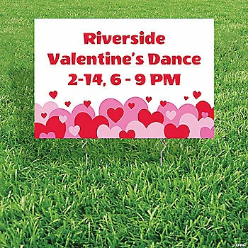 Spread the love with this eye-catching sign featuring a variety of heart shapes along with personalized text. The perfect Valentine’s Day yard sign, this sign can be personalized for any love-related message, from Valentine’s day greetings to marriage proposals and is great as a directional sign for a Valentine’s Day event. Single-sided. Includes metal stakes. Corrugated plastic. 24″ x 16″ Personalize with 3 lines of text. Simple assembly required. © OTC