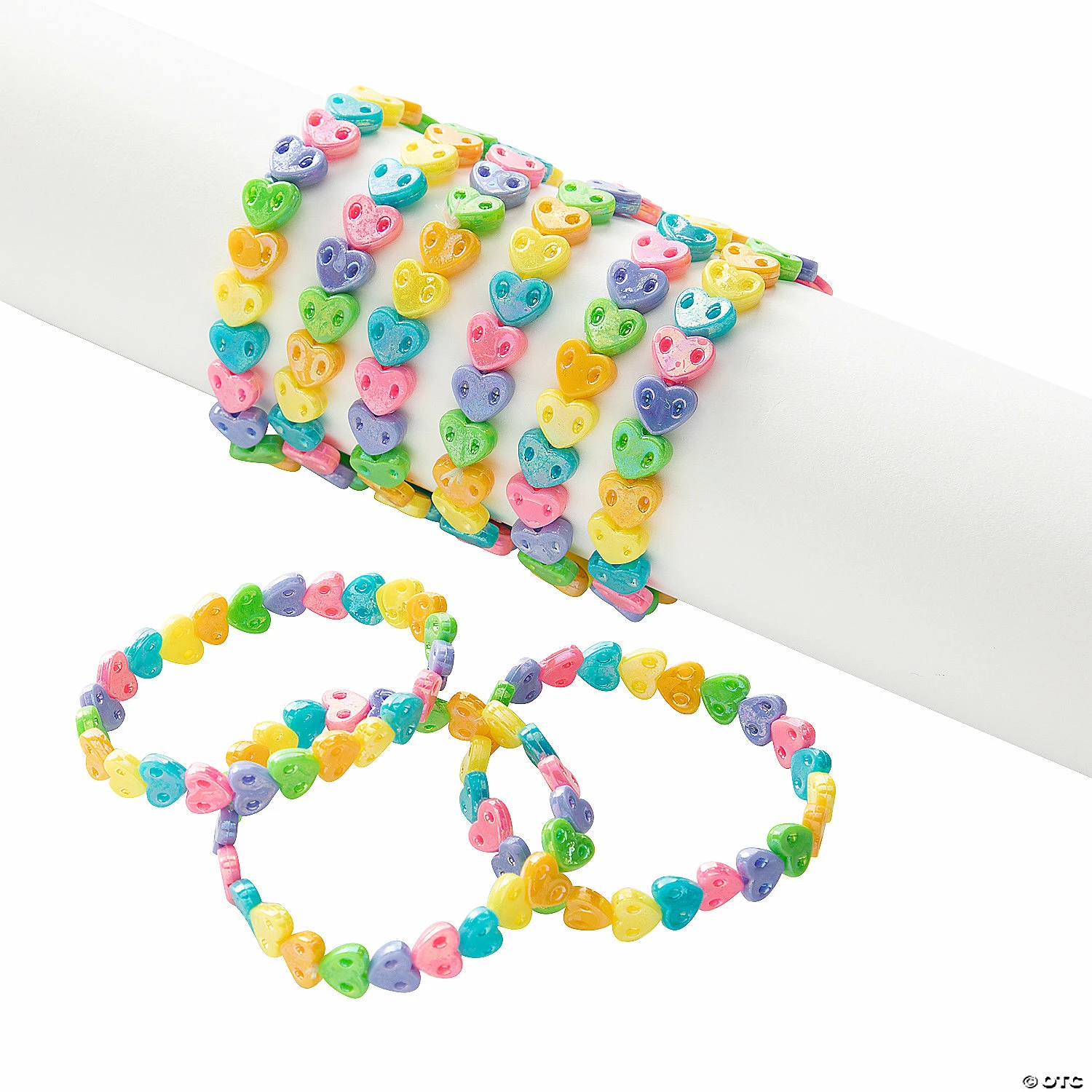 Rainbow Heart Bracelets. Plastic heart beads make these bracelets perfect Valentine or princess party favors! To create a fun table setting, use them as napkin rings. Elastic bands. 7″ circ.