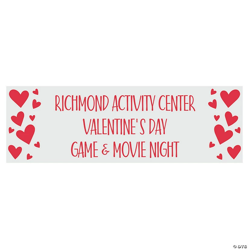 Advertise your upcoming Valentine’s Day event or draw attention to your party with a personalized banner so your guests can’t miss it! You can hang it up in the community center or home to commemorate the party with fun photo ops. The banner is framed in hearts! Personalize with 3 lines of text Vinyl. Includes adhesive tabs for hanging. © OTC