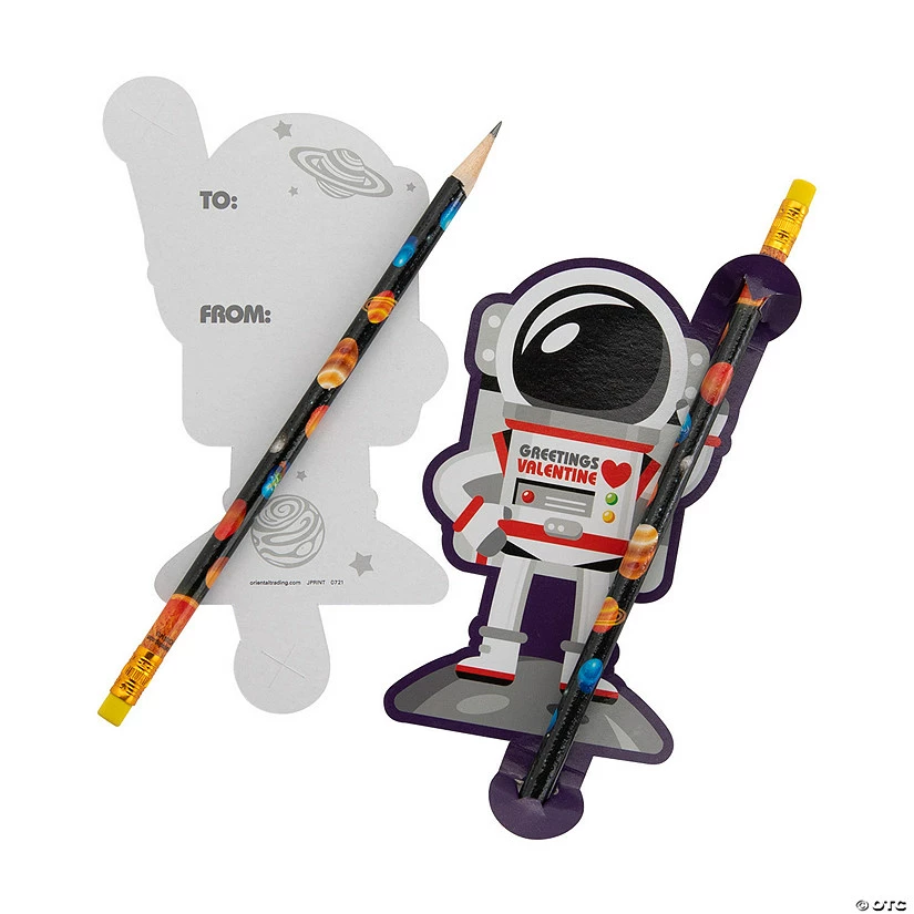 These Valentine’s Day gifts are out of this world! Featuring astronaut-shaped cards and pencils bearing images of planets, Valentine’s Day party guests will love these cute, useful party favors. Includes 3 1/2″ x 6 1/2″ cardstock cards with To/From space. (2 dozen per unit) Wood pencil, 7 1/2″. Simple assembly required. © OTC