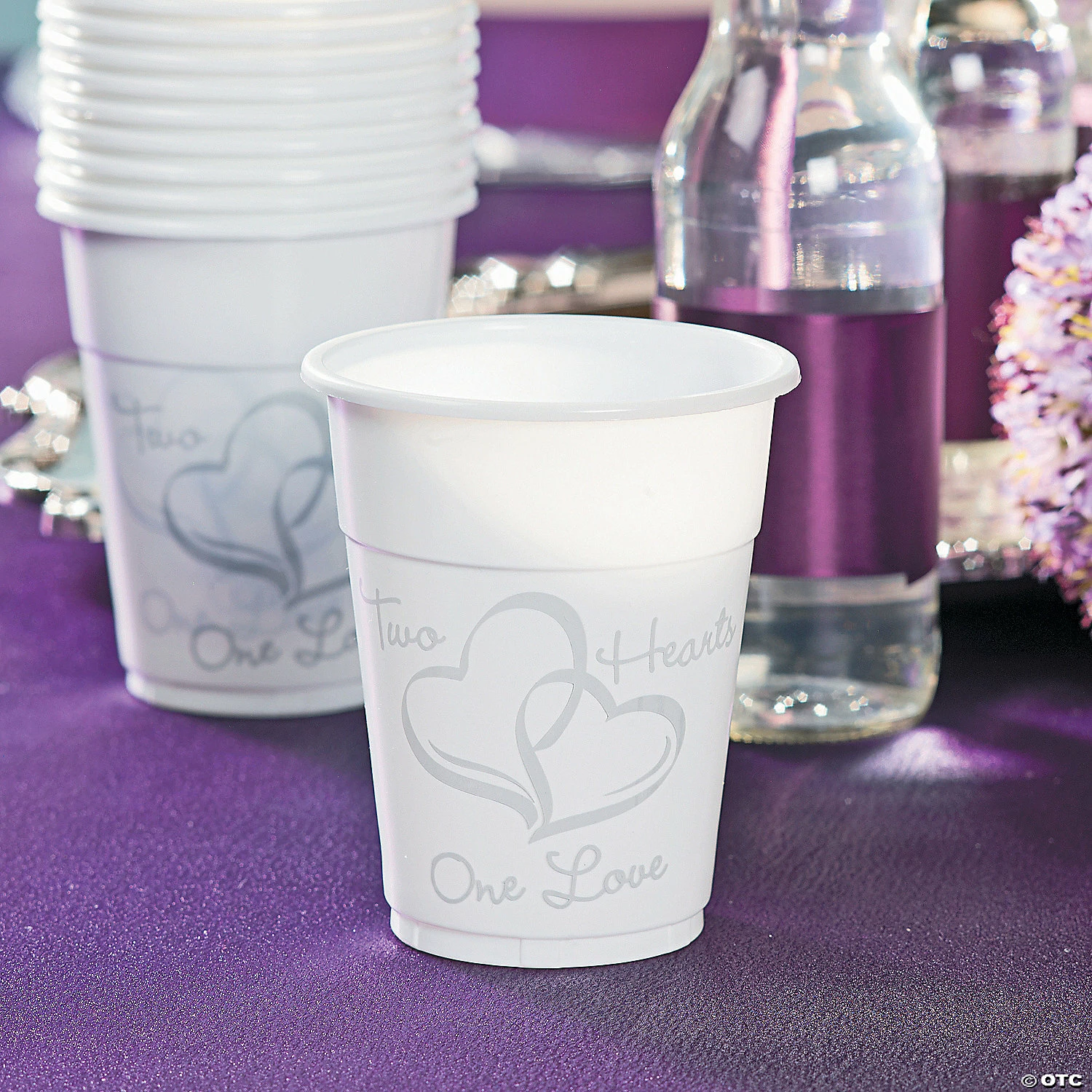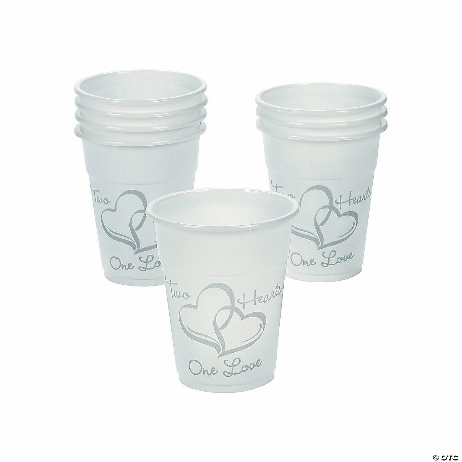 Two Hearts Wedding Disposable Plastic Cups. Make each toast special with these disposable plastic cups! Printed with “Two Hearts One Love” and a two hearts design, they’re perfect for a wedding reception or bridal shower. Plastic. (50 pcs. per unit) 4 1/2″ 16 oz. © OTC