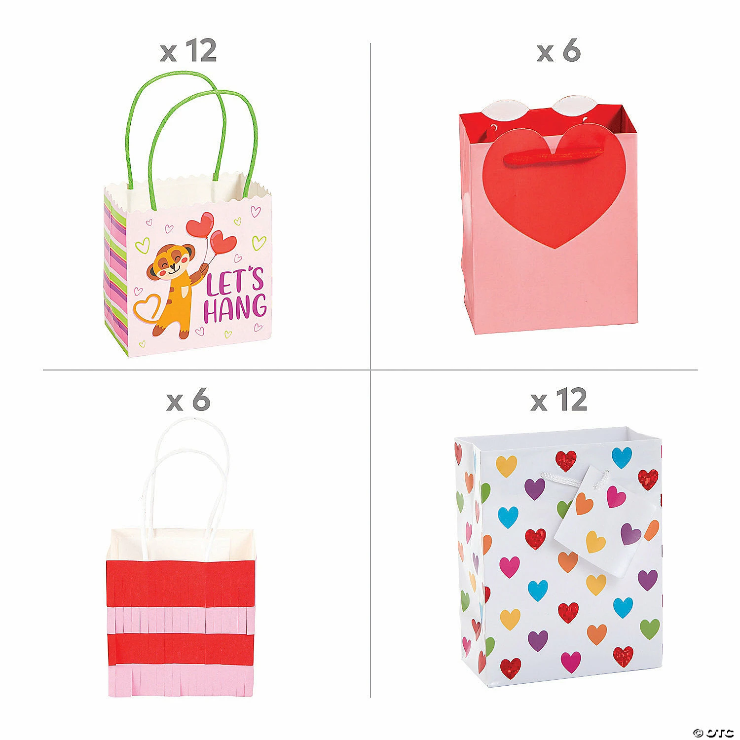 Hand out some love with these adorable gift bags featuring hearts and other Valentine’s Day themes. Stock up on Valentine’s Day gift bags for your gift wrapping supplies and be ready for the love-filled holiday. Hand out Valentine’s Day swag bags to employees, clients, friends or students with these cute gift bags. (36 pcs. per unit) Includes:• 12 Paper Small Foil Hearts Gift Bags (4 1/2″ x 2 1/2″ x 5 1/2″ with 5″ nylon handles.)• 6 Paper Valentine Die-Cut Heart-Shaped Gift Bags (4 1/2″ – 10″ x 2 1/2″ – 5 1/4″ x 5 1/2″ – 13″)• 12 Paper Small Valentine Meerkat Gift Bags (5″ x 3″ x 5″)• 6 Paper Small Valentine Fringe Gift Bags (4 1/2″ x 2 3/4″ x 4 1/2″ with 3 1/2″ handles.)• Assortments are subject to change at any time and may vary from picture shown. Substituted items will be similar in nature.