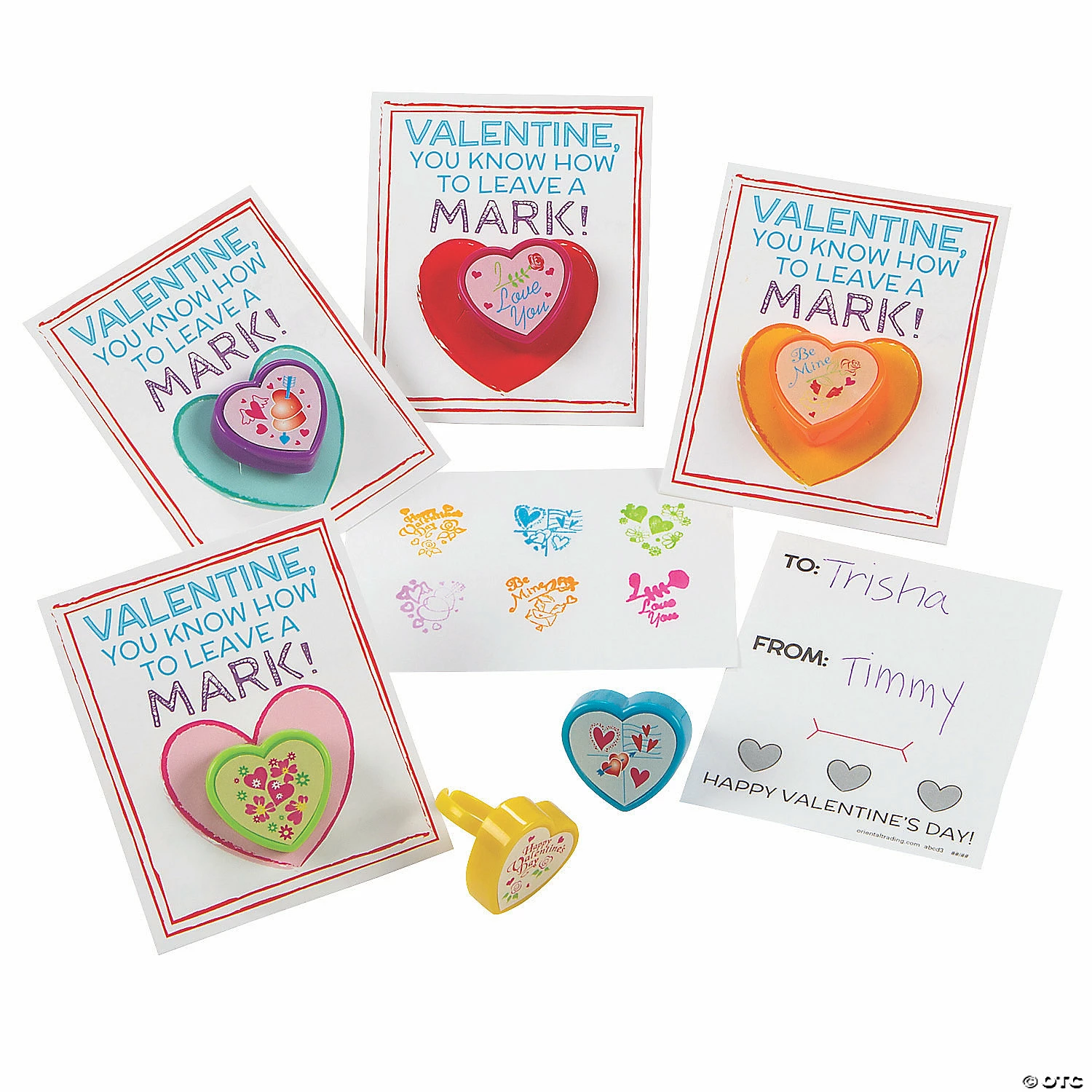 Discover the art of love with these Valentine’s Day giveaways. The heart-shaped ring stampers feature phrases like, “Be Mine” and “Love You” and come with cards printed with “Valentine, you know how to leave a mark!” Kids can pass these out to their friends as classroom exchange gifts or as Valentine’s Day party favors! Includes To/From space on 2 1/2″ x 3″ cardstock card. Safe and non-toxic. Plastic. 1″ diam. Conforms to ASTM D-4236. Simple assembly required. © OTC